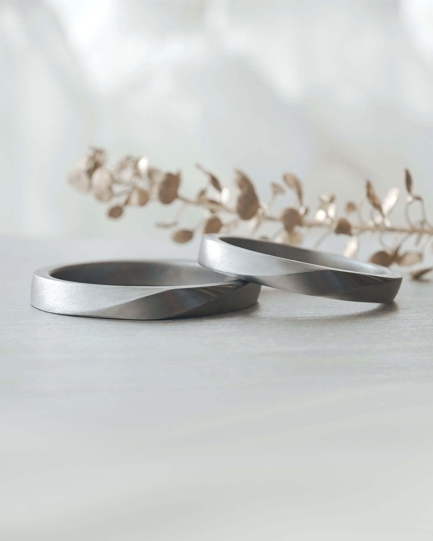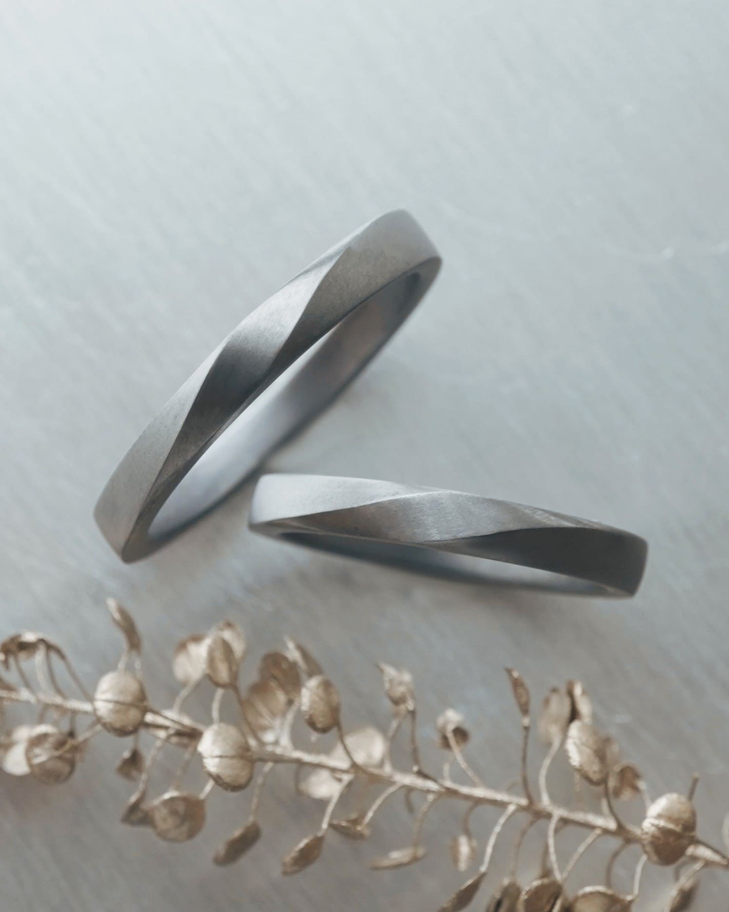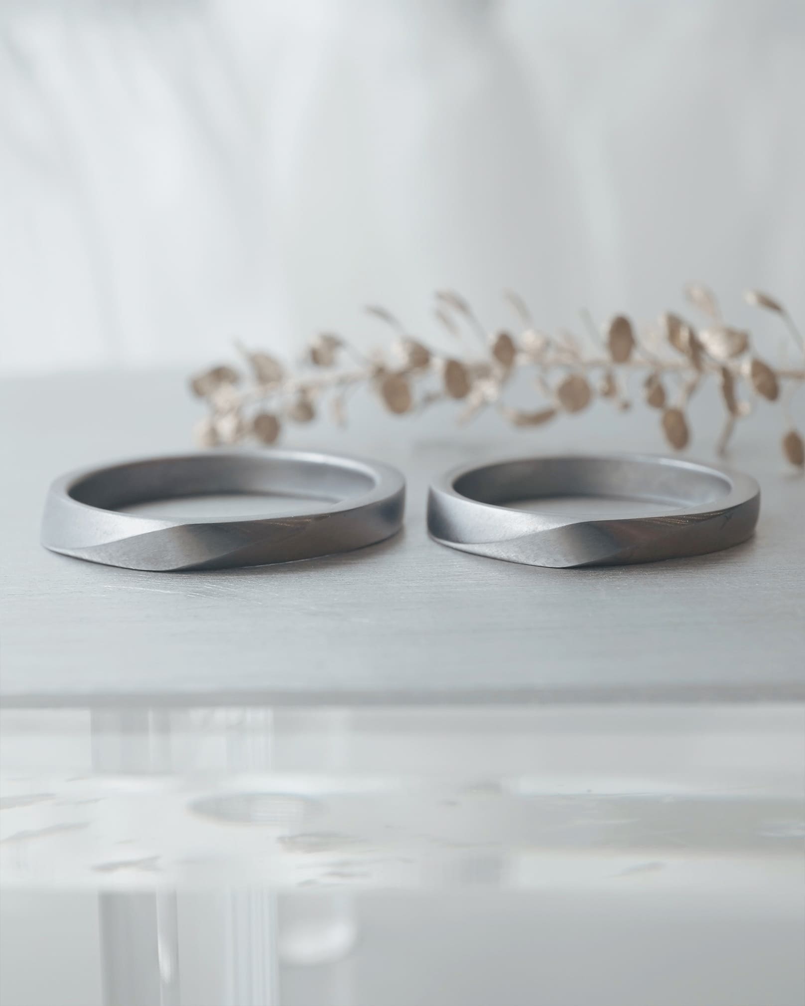 時を刻んでも美しい 変わらない愛がテーマ タンタル素材で作製した結婚指輪 ストレートにひねりを加えています ホーニング艶消しとヘアラインを施していますが変更可能です