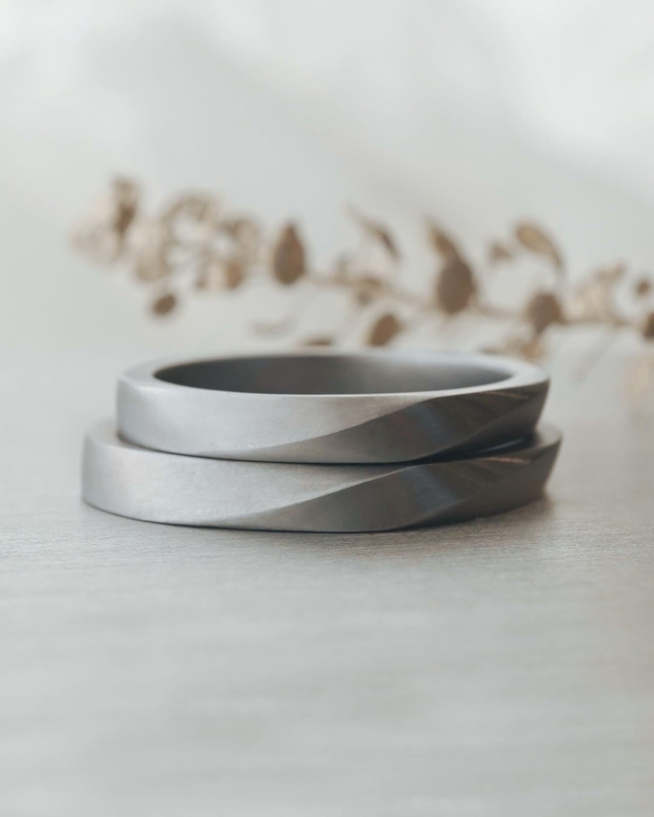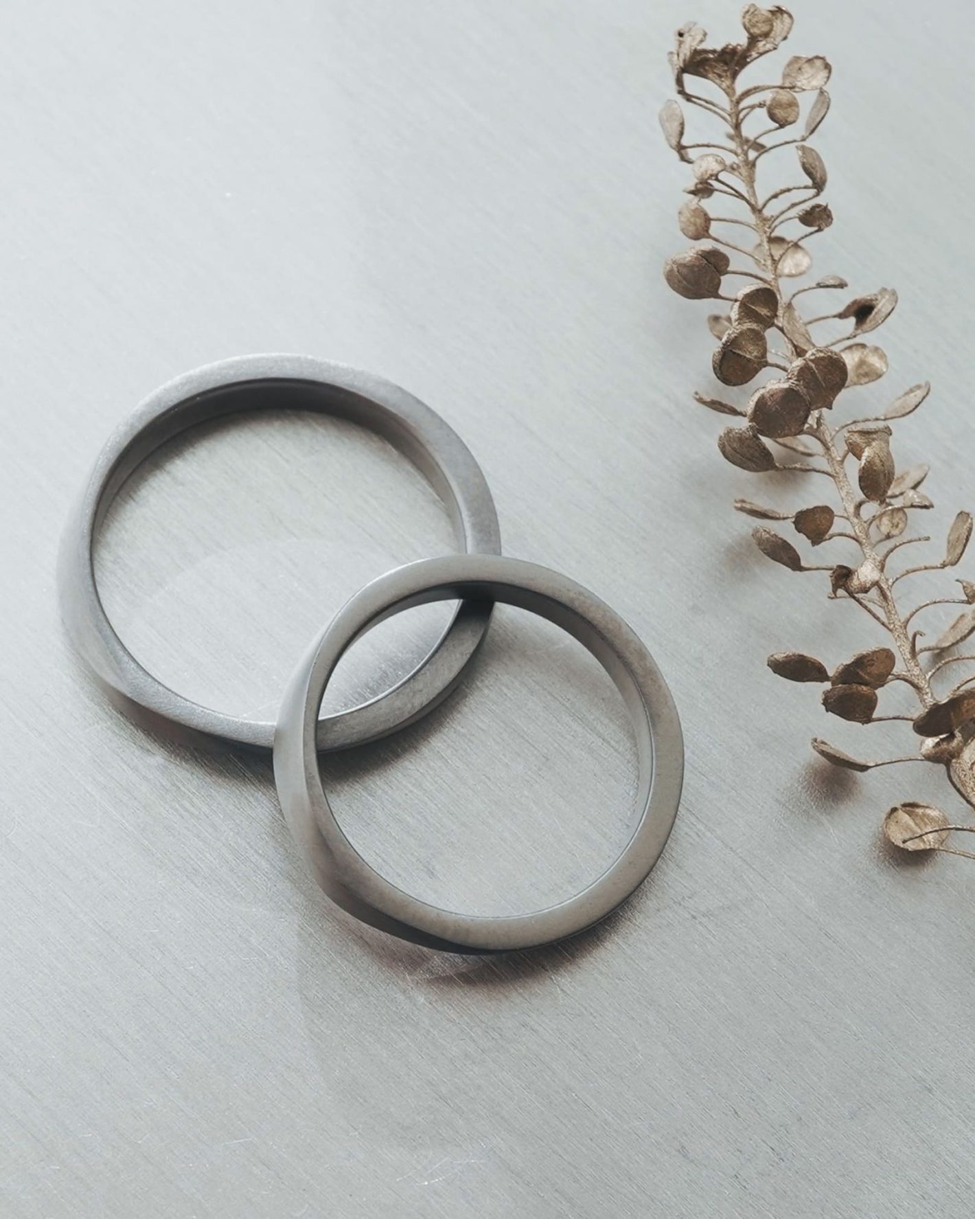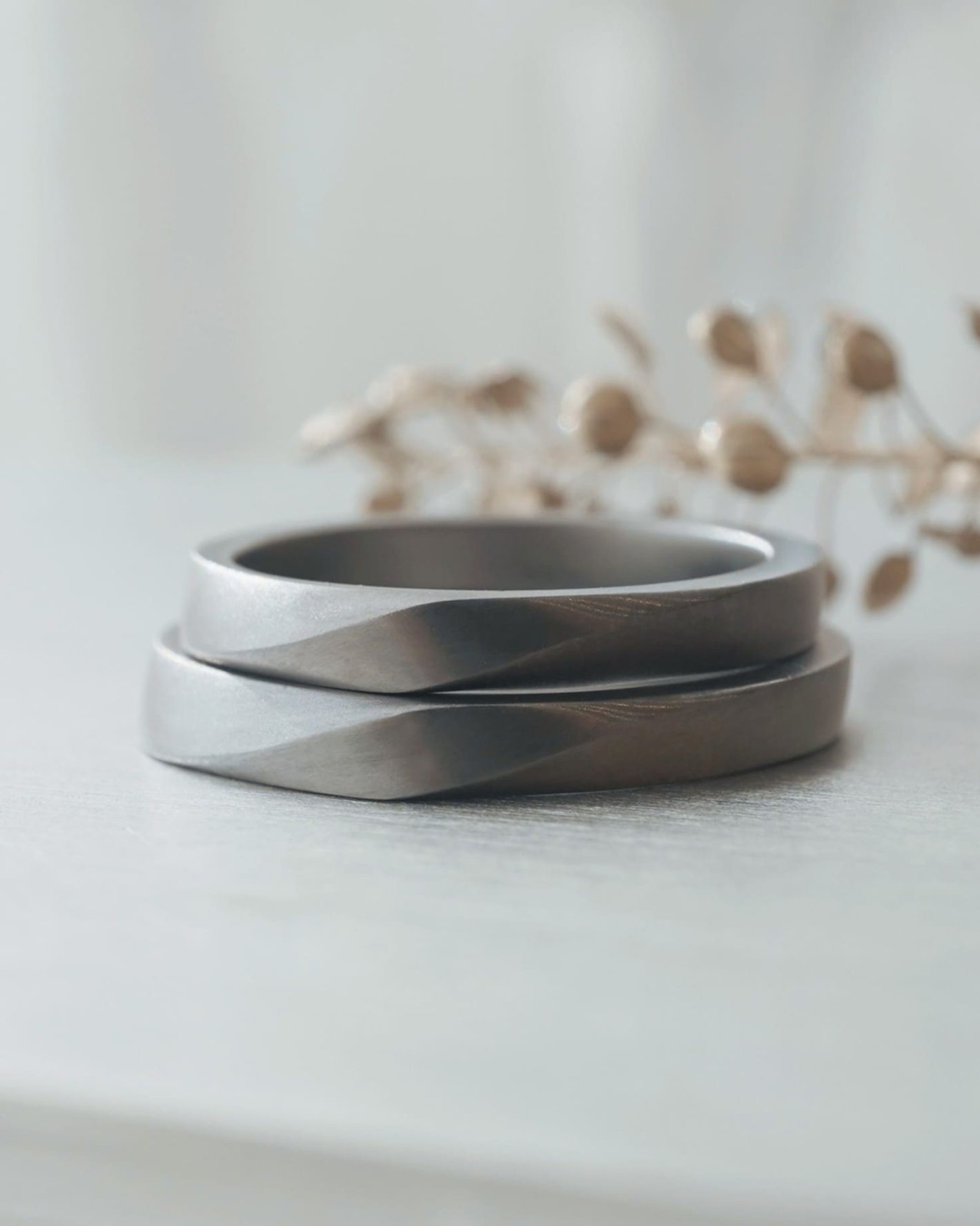 時を刻んでも美しい 変わらない愛がテーマ タンタル素材で作製した結婚指輪 ストレートにひねりを加えています ホーニング艶消しとヘアラインを施していますが変更可能です