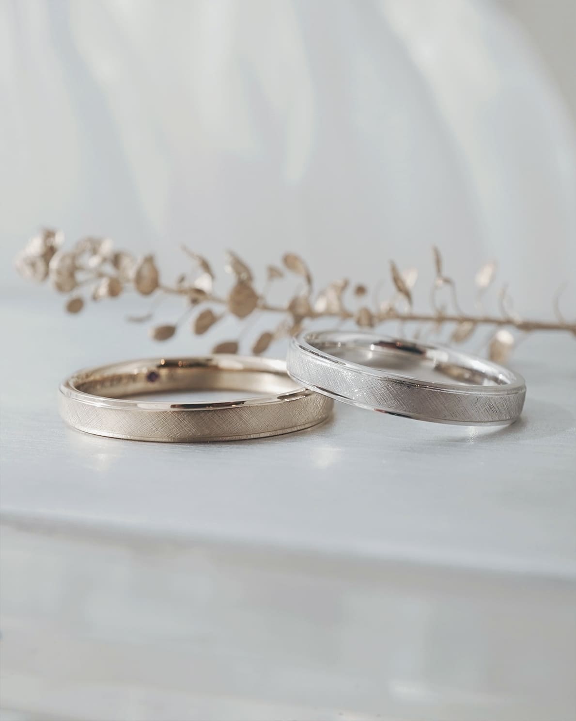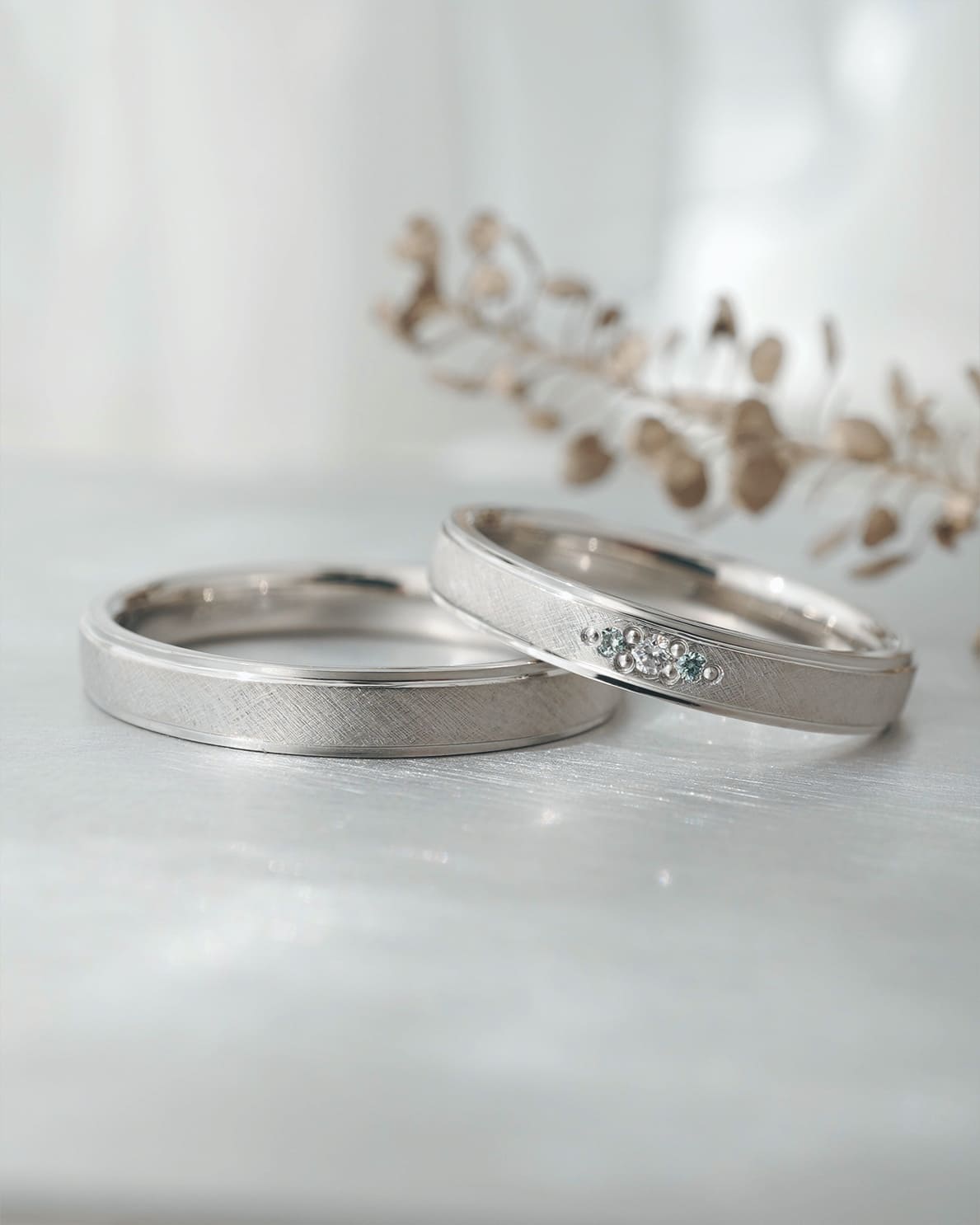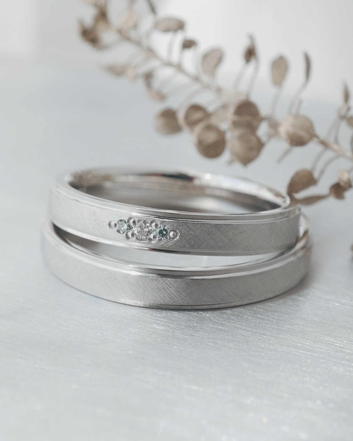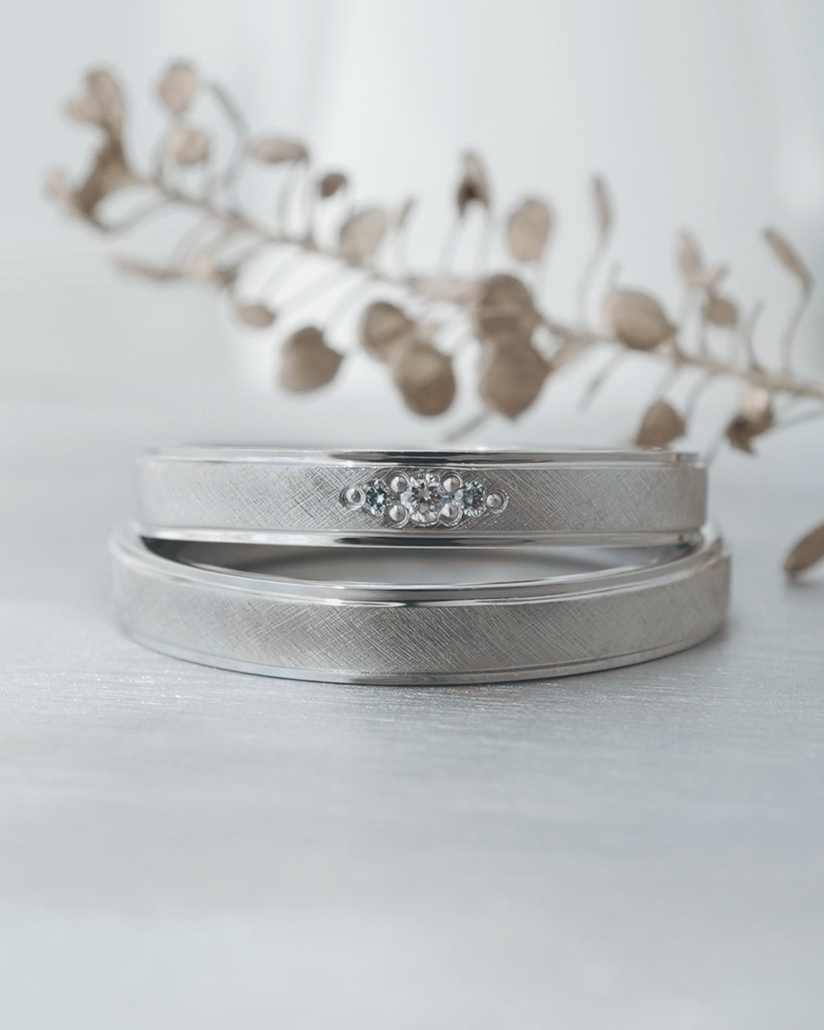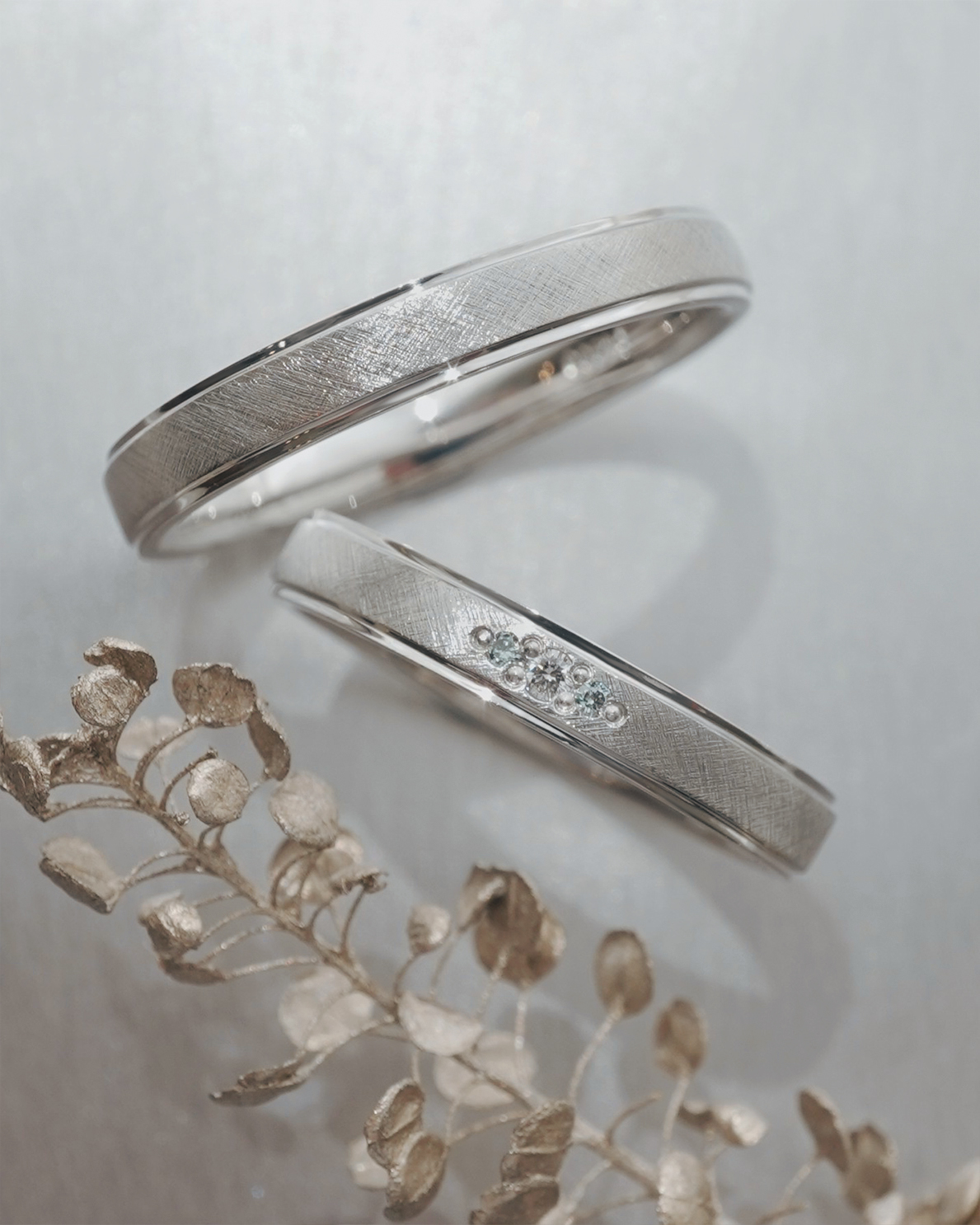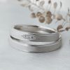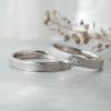 Men’s(下):Pt950 幅平均3㎜ 厚み平均1.6mm Lady’s(上):Pt950 幅平均3mm 厚み平均1.6mm ホワイトダイヤ1石 0.01ct アイスブルーダイヤ2石 0.01ct