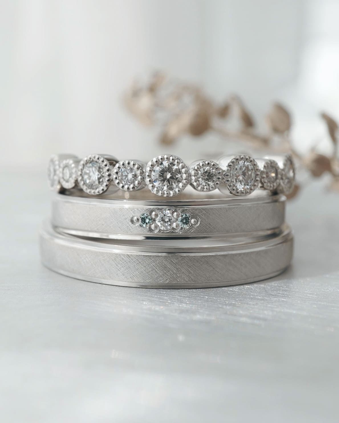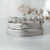 夜空の星々をつないで星座を作るようなデザイン ふたりの運命をひとつに結ぶ結婚指輪 ダイヤモンドサイズは小大小で留めています 爪は共有留めしているのでひとつのダイヤが留まっているように見えます