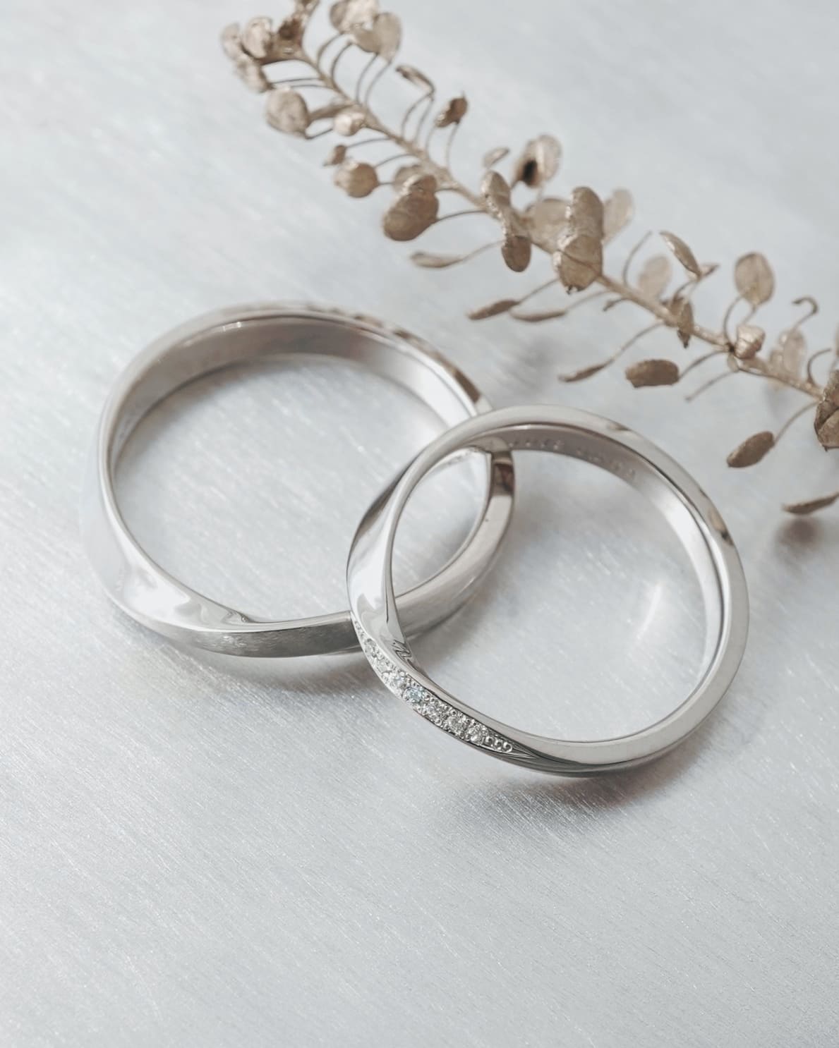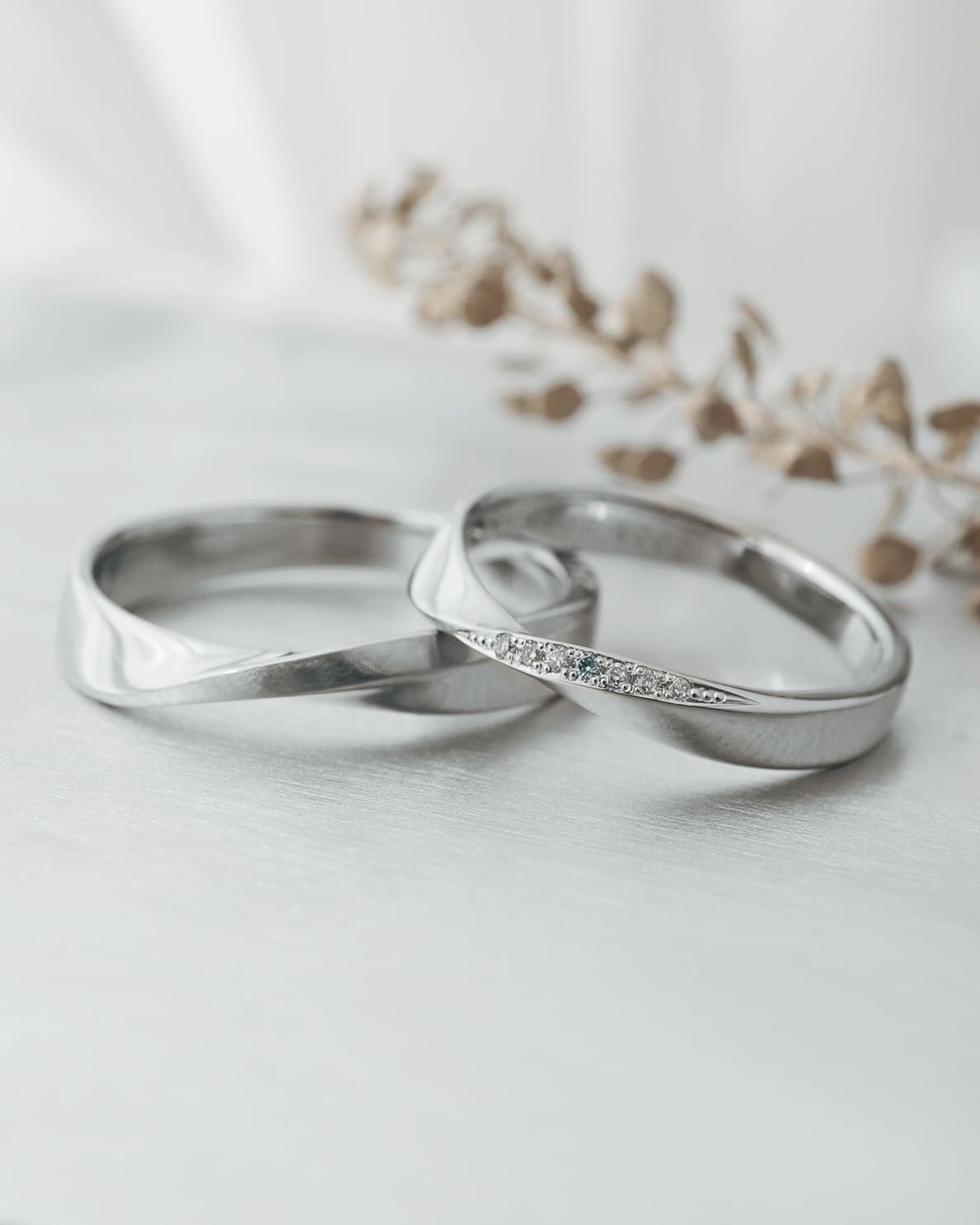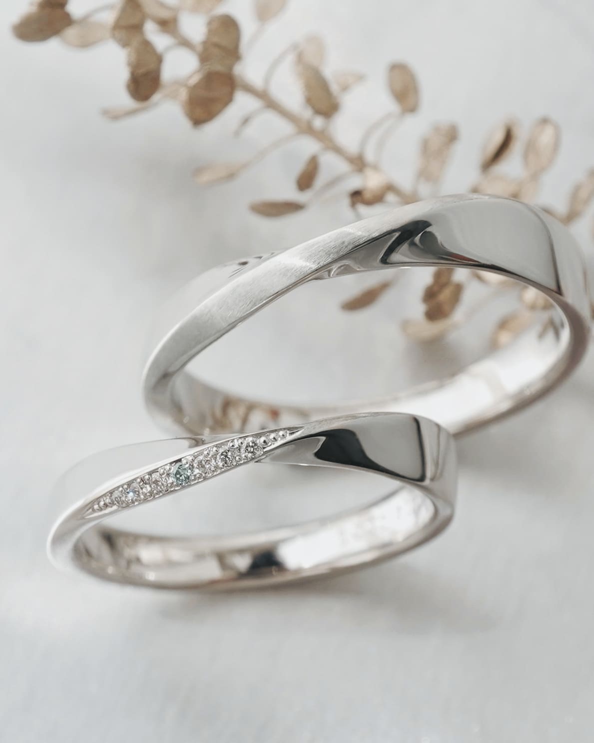 Men’s(下):Pt950 最大幅3.6mm 厚み平均1.7mm Lady’s(上):Pt950 最大幅3.2mm 厚み平均1.5mm ホワイトダイヤ6石 0.018ct アイスブルーダイヤ1石 0.003ct