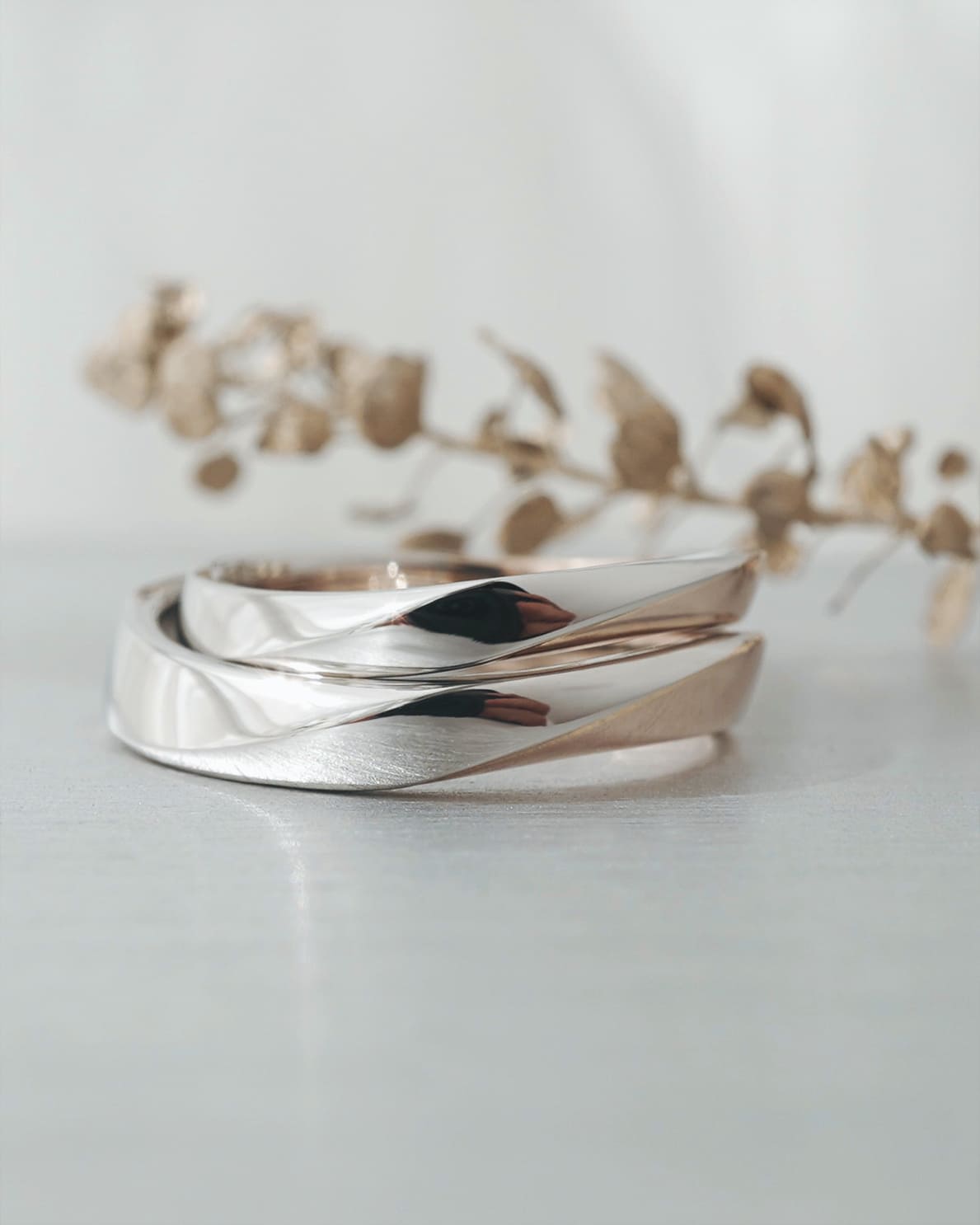 光を意味する結婚指輪 左側と右側で異なる金属色を楽しめるデザイン 鏡面で仕上げていますが、部分的に表面加工を施すこともお勧めしております