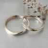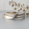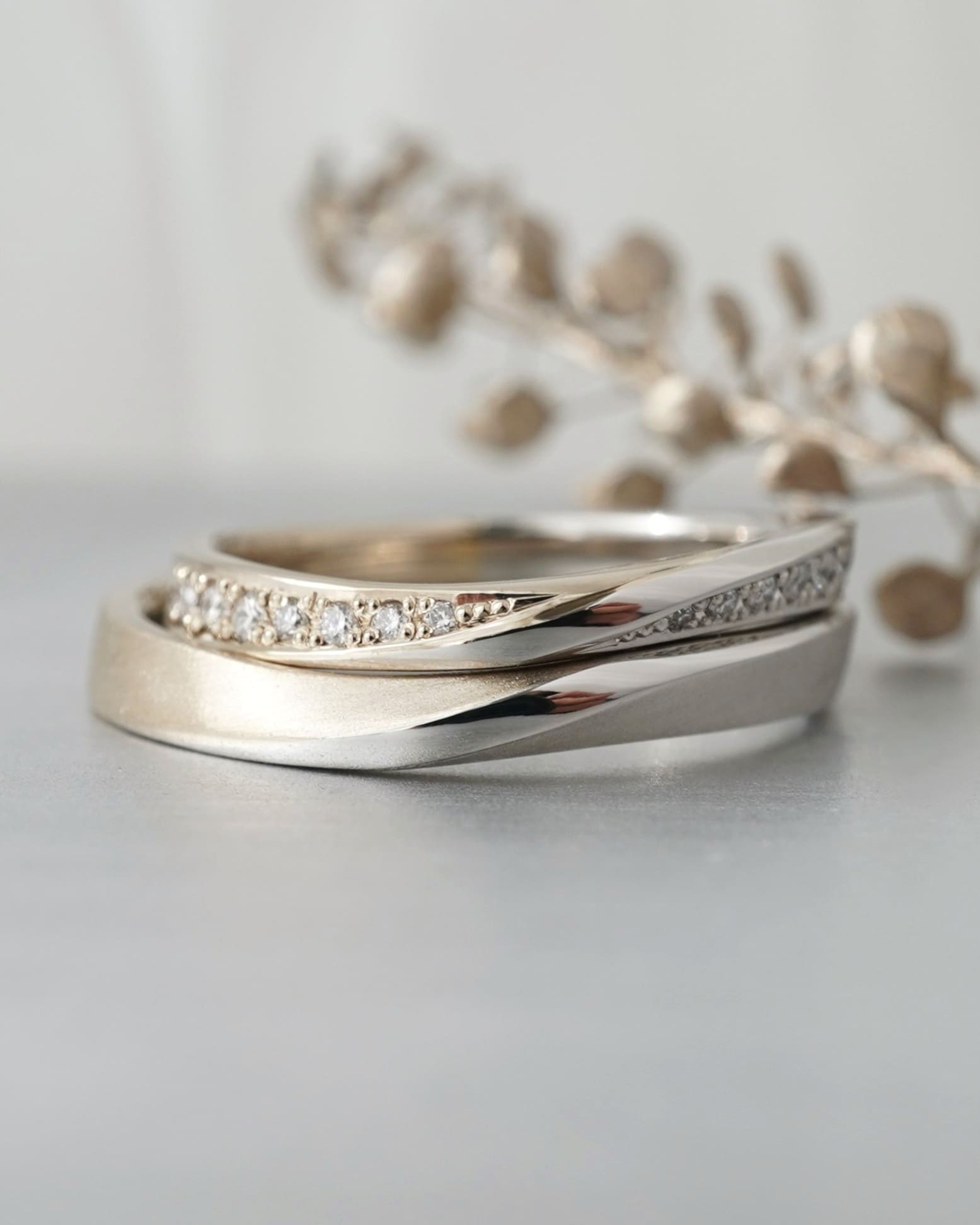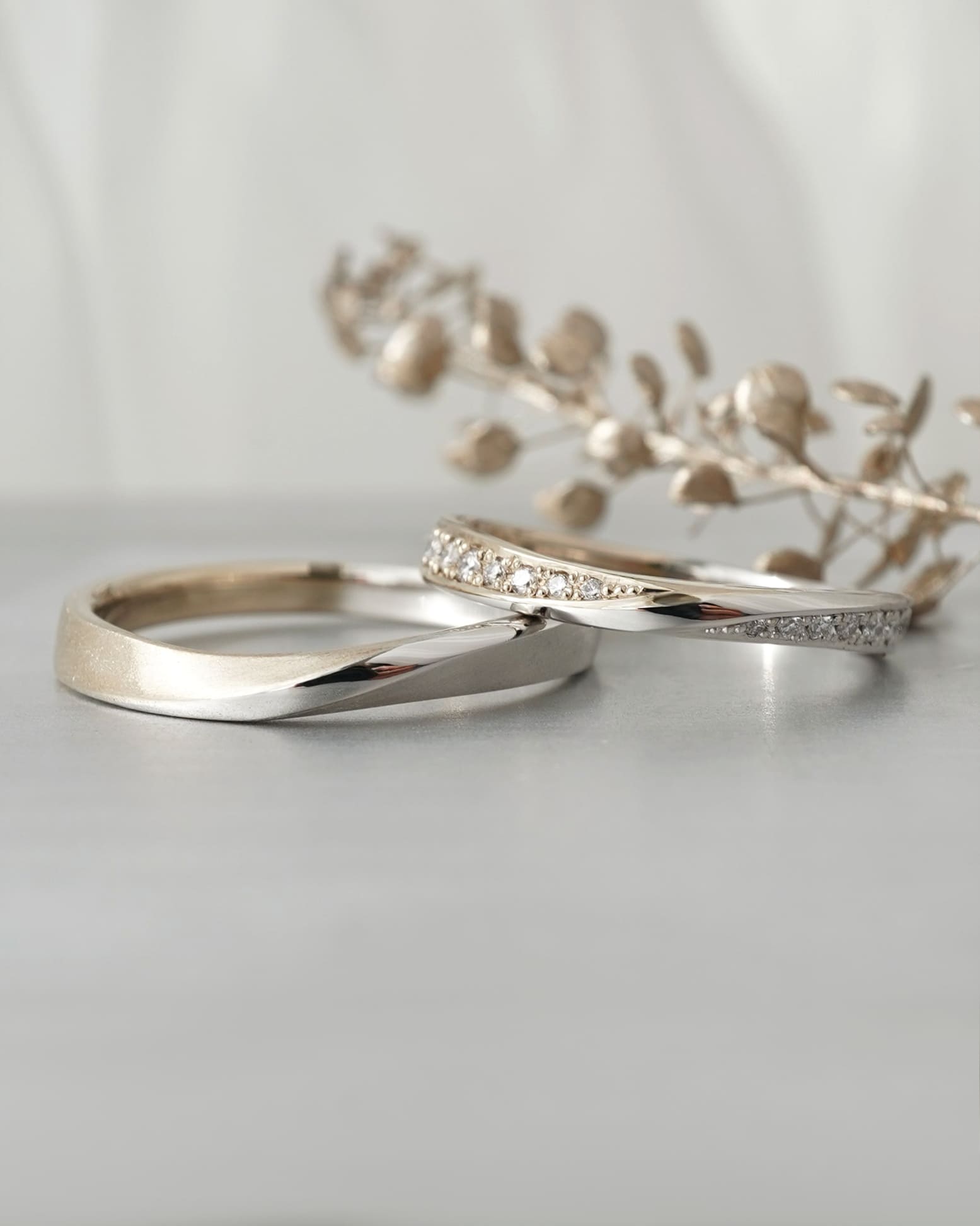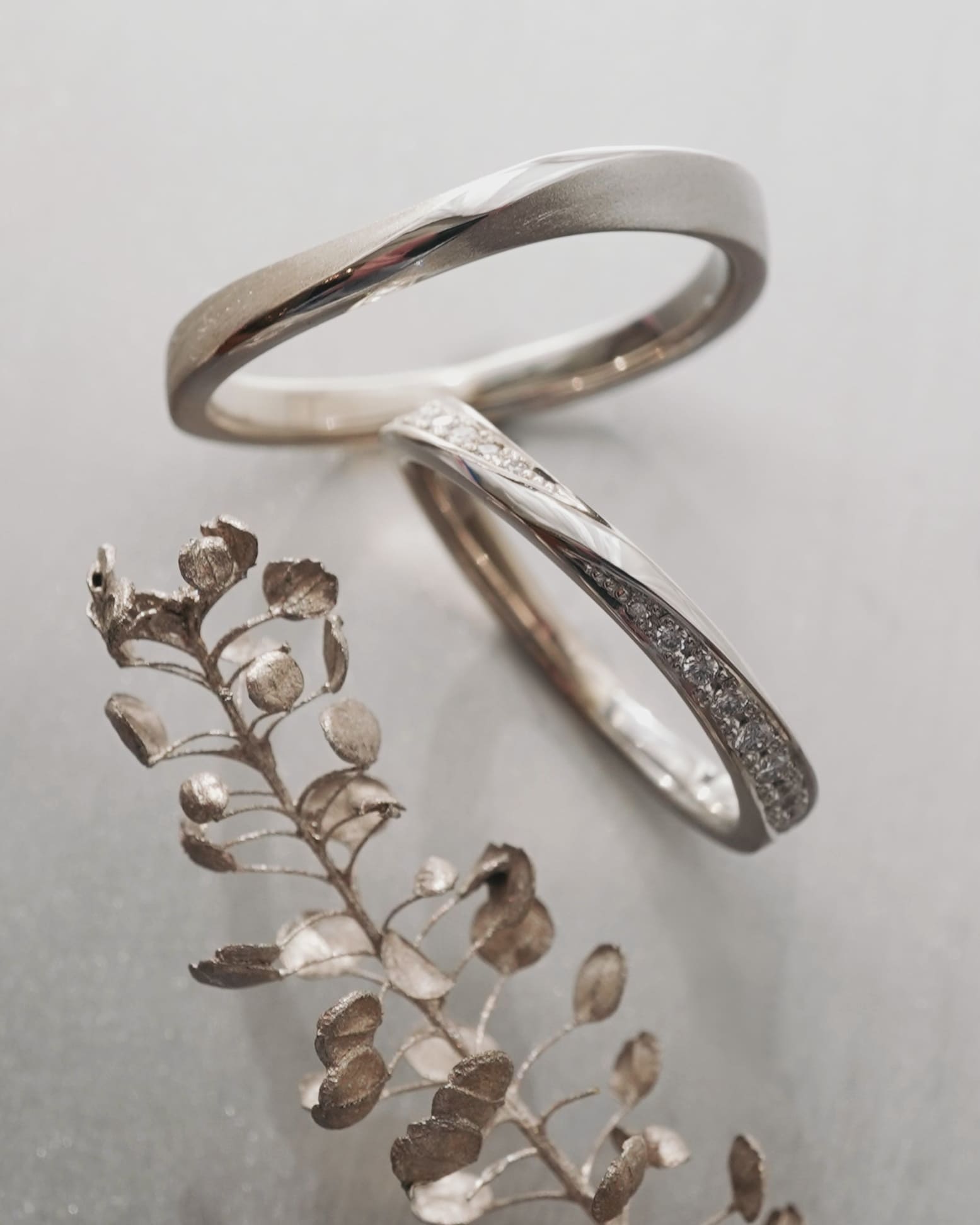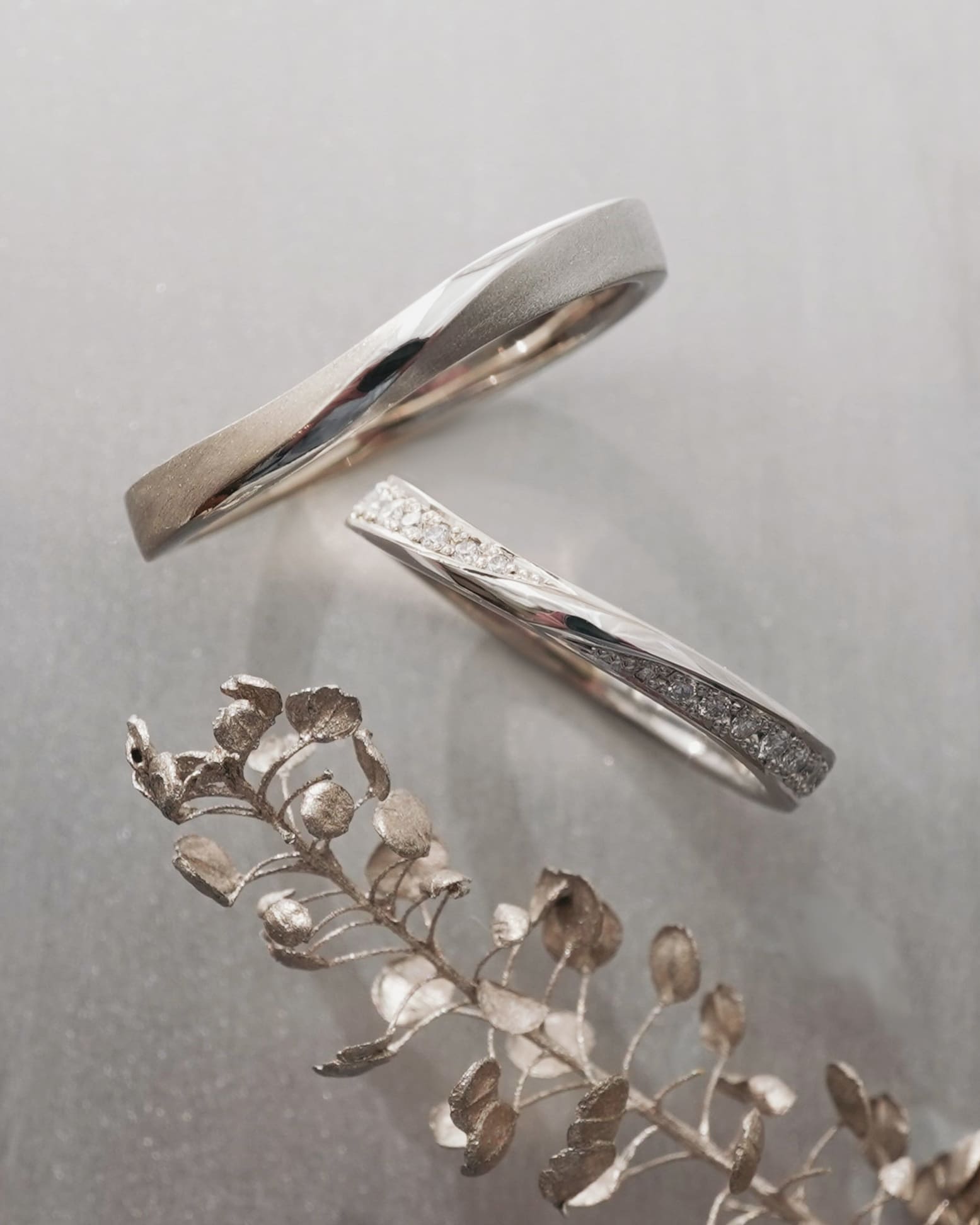 そよ風の空気感を表現した結婚指輪 太陽の光に照らされて、心地よい風が吹いているよう 中央ラインのシルエットは細身です 左右に向けてワイドな幅になります 見た目は細身の指輪デザインです