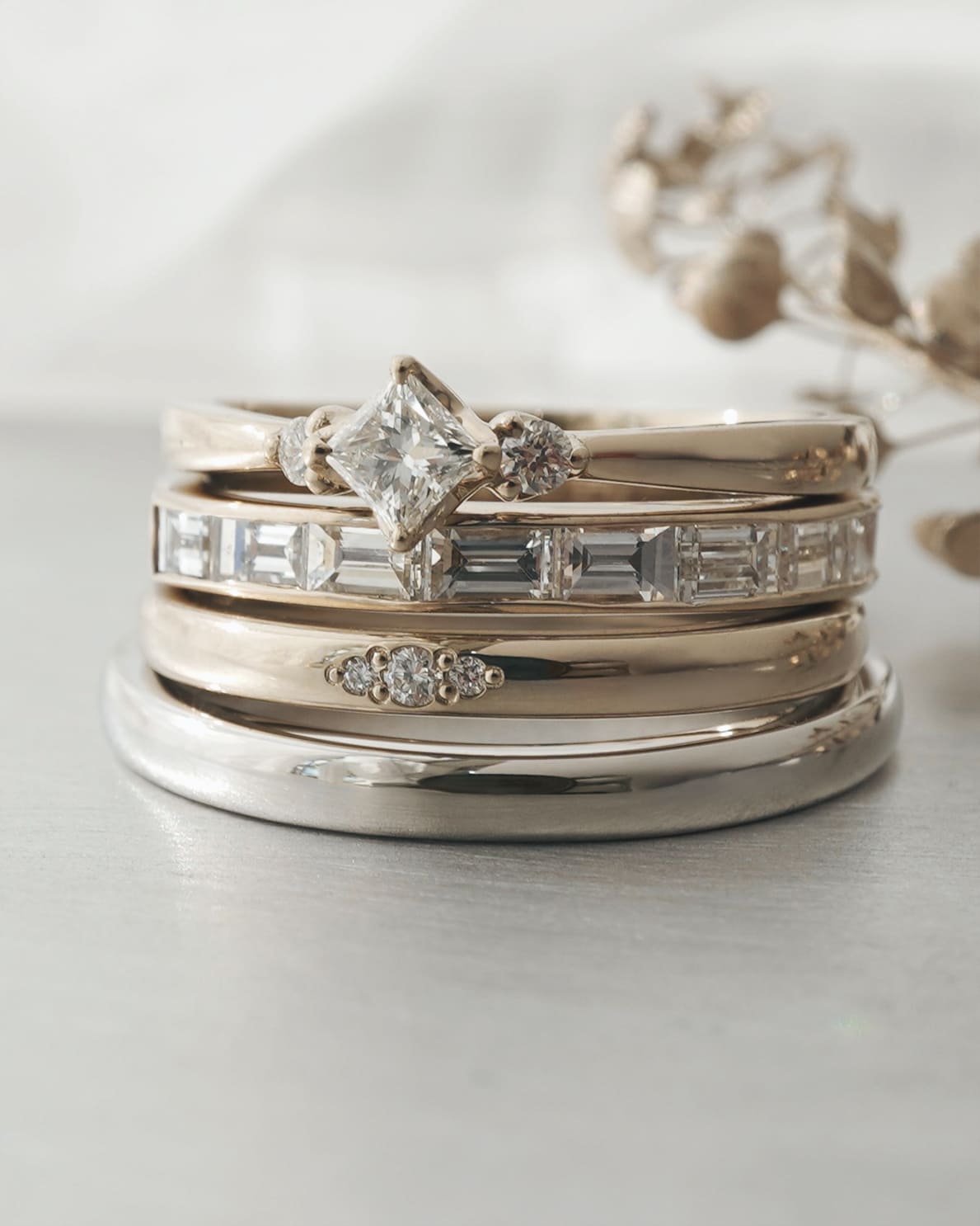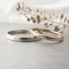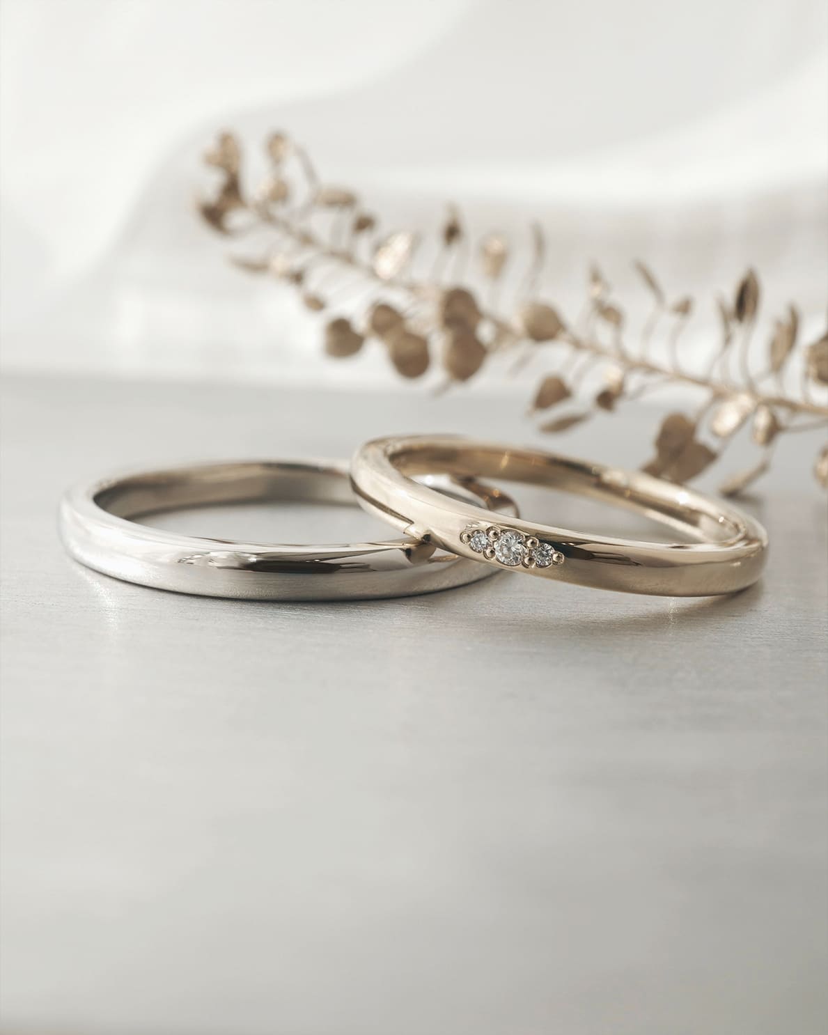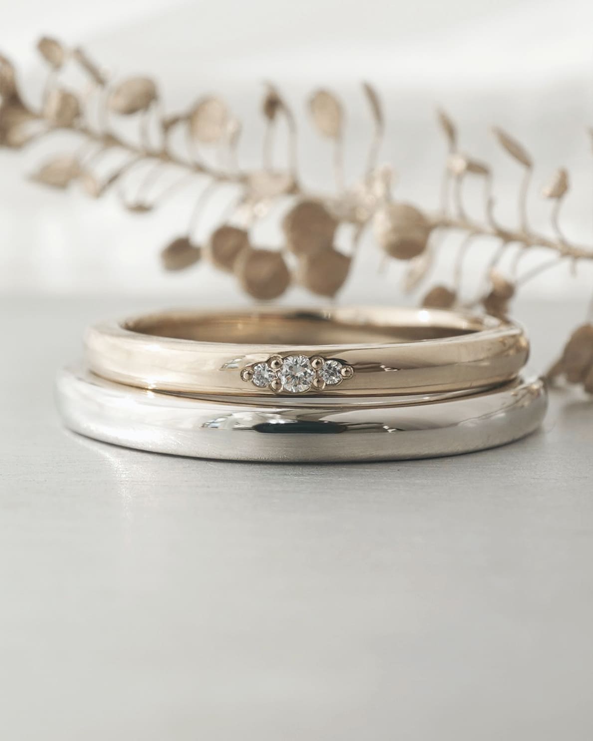 Men’s(下):Pt950 幅2.3㎜ 厚み平均1.8㎜ Lady’s(上):K18シャンパンゴールド 幅2.1㎜ 厚み平均1.8㎜ ホワイトダイヤ3石 0.022ct