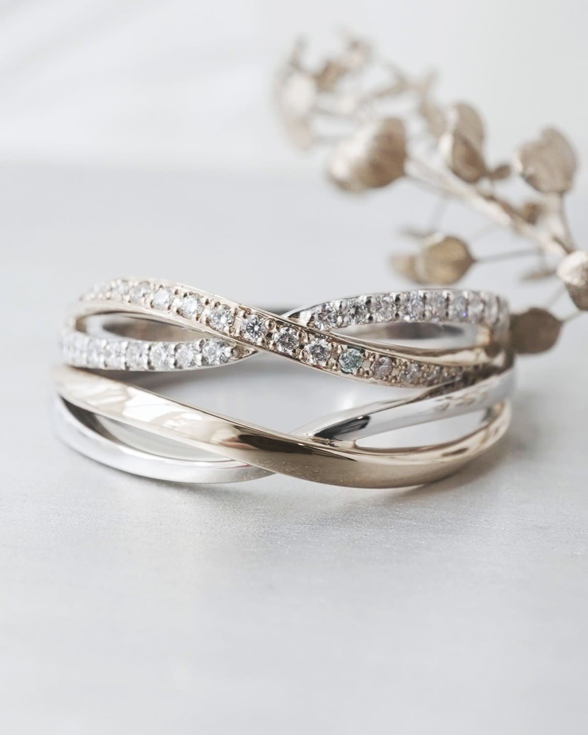 爽やかな風が吹き抜けるようなデザイン レディースリングはダイヤモンドを全面に留めた華やかな仕上げです