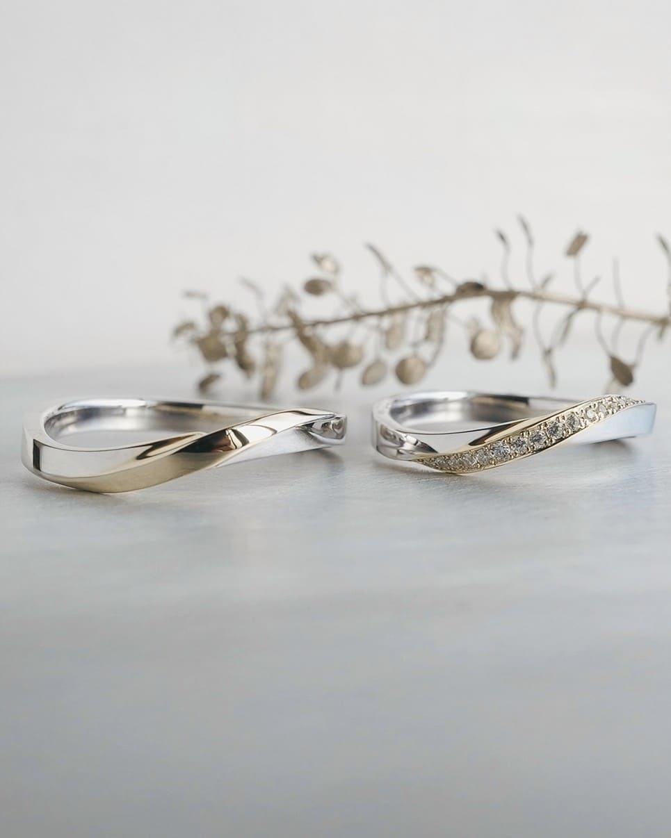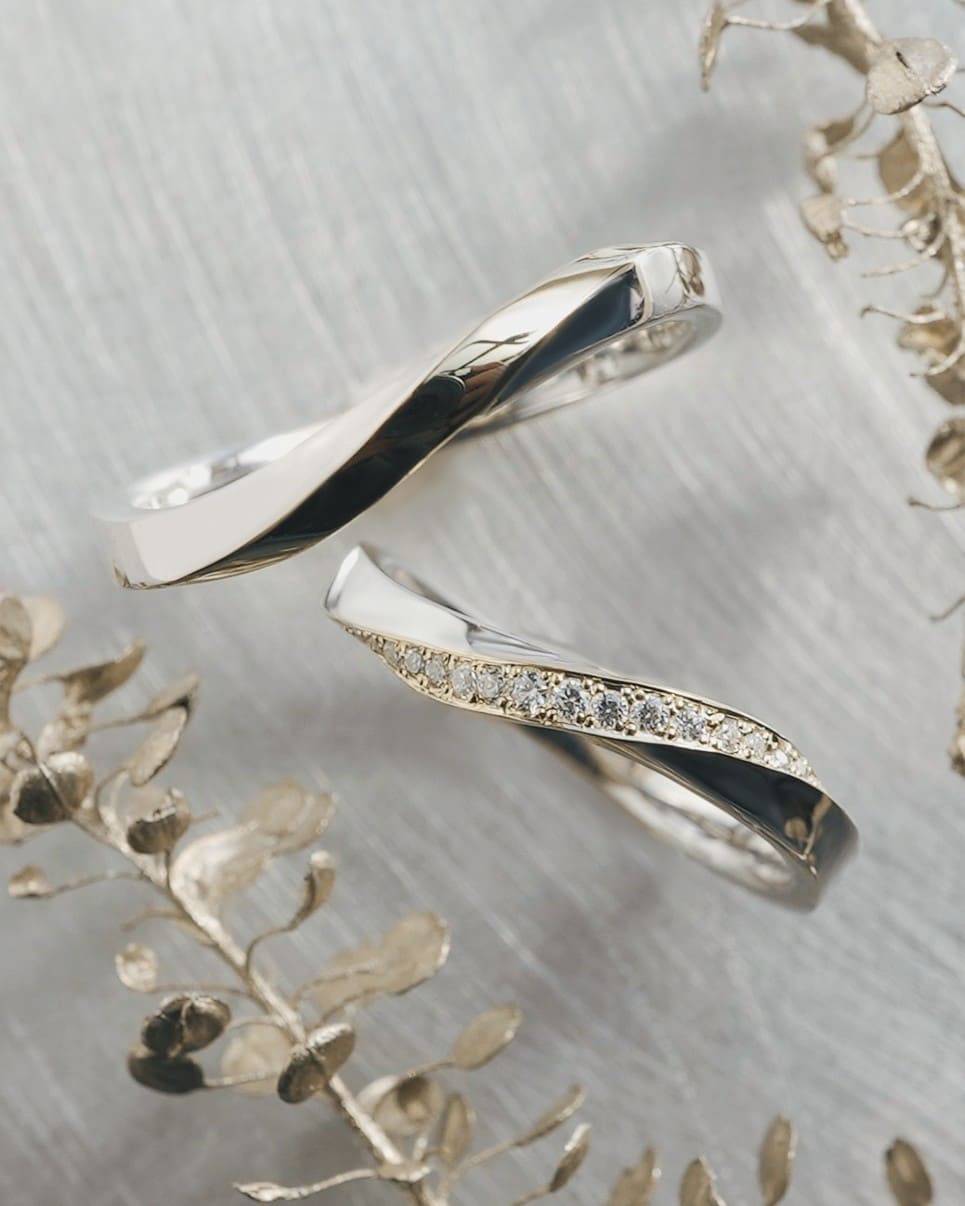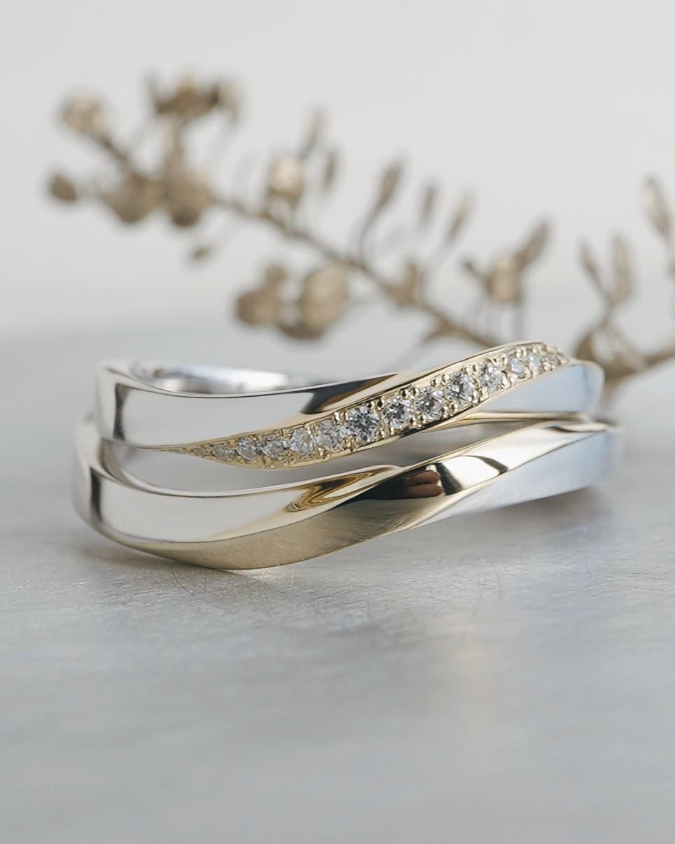 結びつき、花開く二人の時間 緩やかなウェーブは花の揺らぎをイメージ ゴールドのラインが重なり合うことで新しい輝きが生まれる