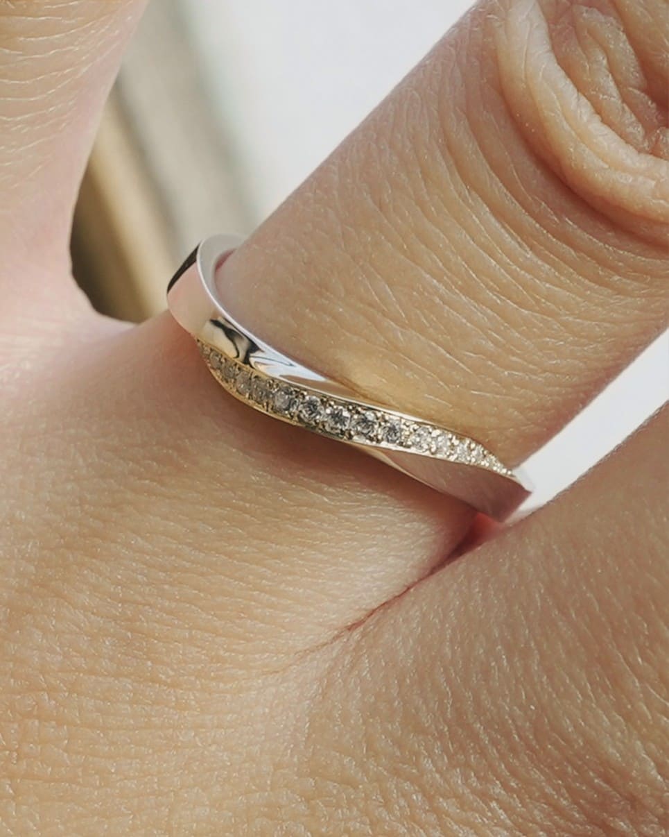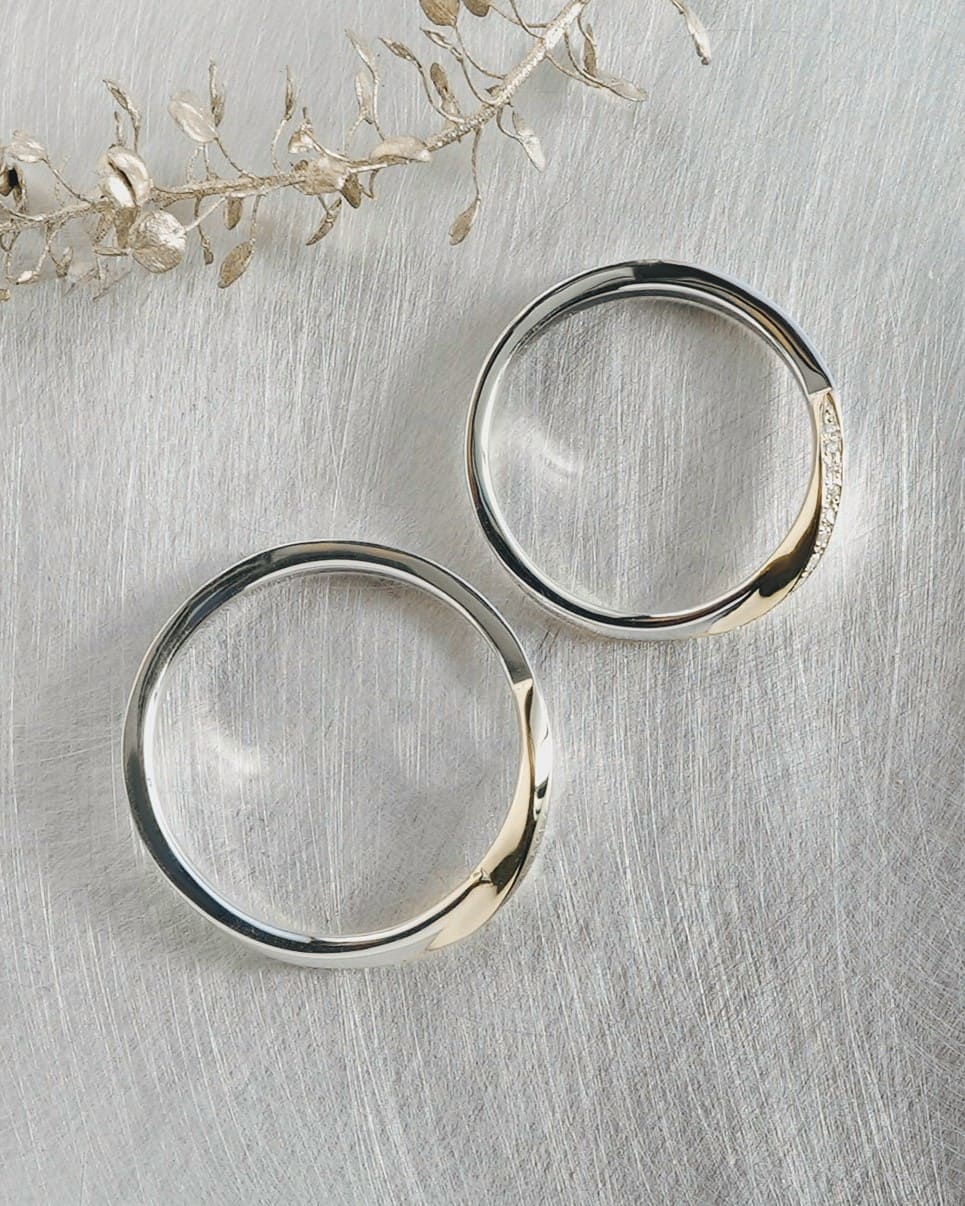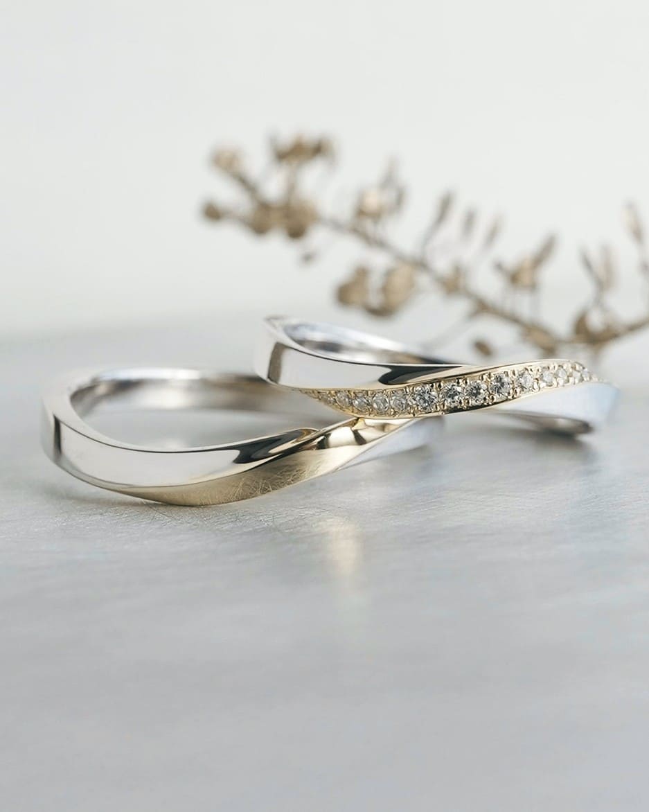 結びつき、花開く二人の時間 緩やかなウェーブは花の揺らぎをイメージ ゴールドのラインが重なり合うことで新しい輝きが生まれる